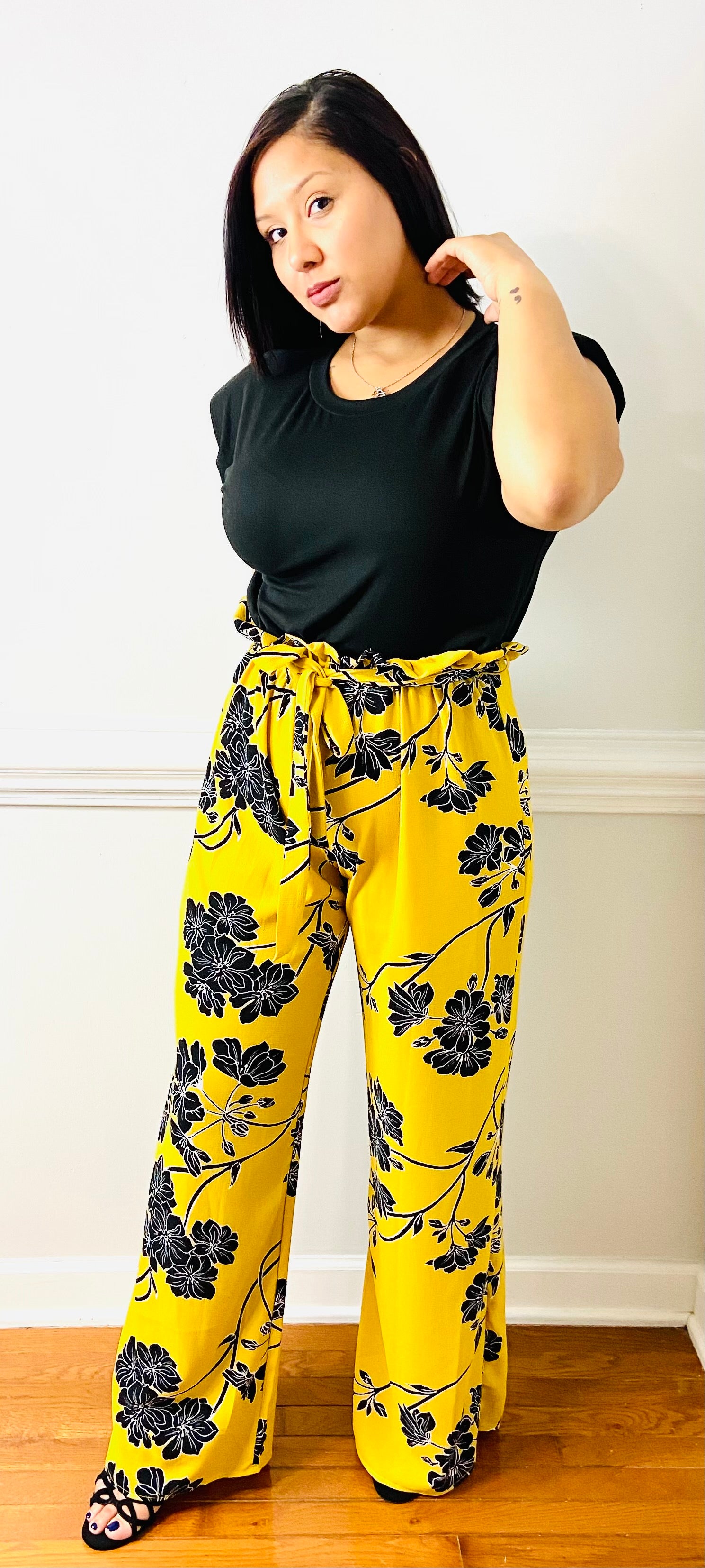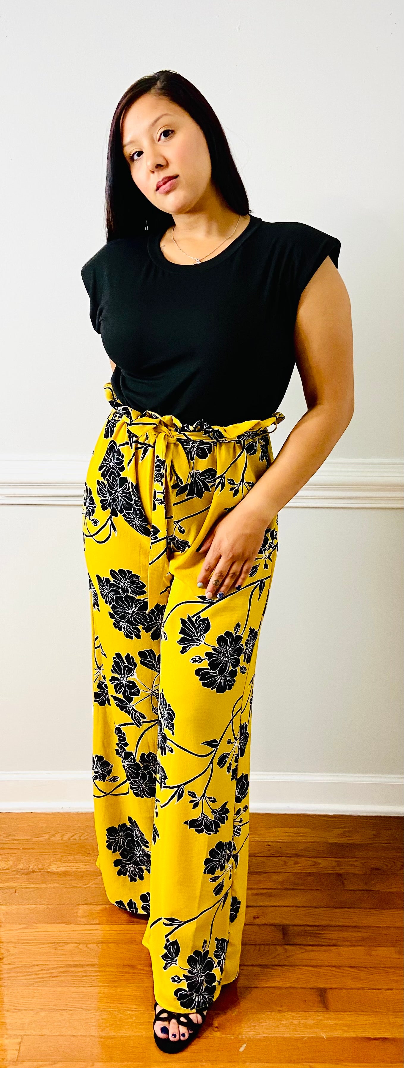 It is a beautiful black and mustard neck top with a shoulder pad jumpsuit tie waist and keyhole on the back.