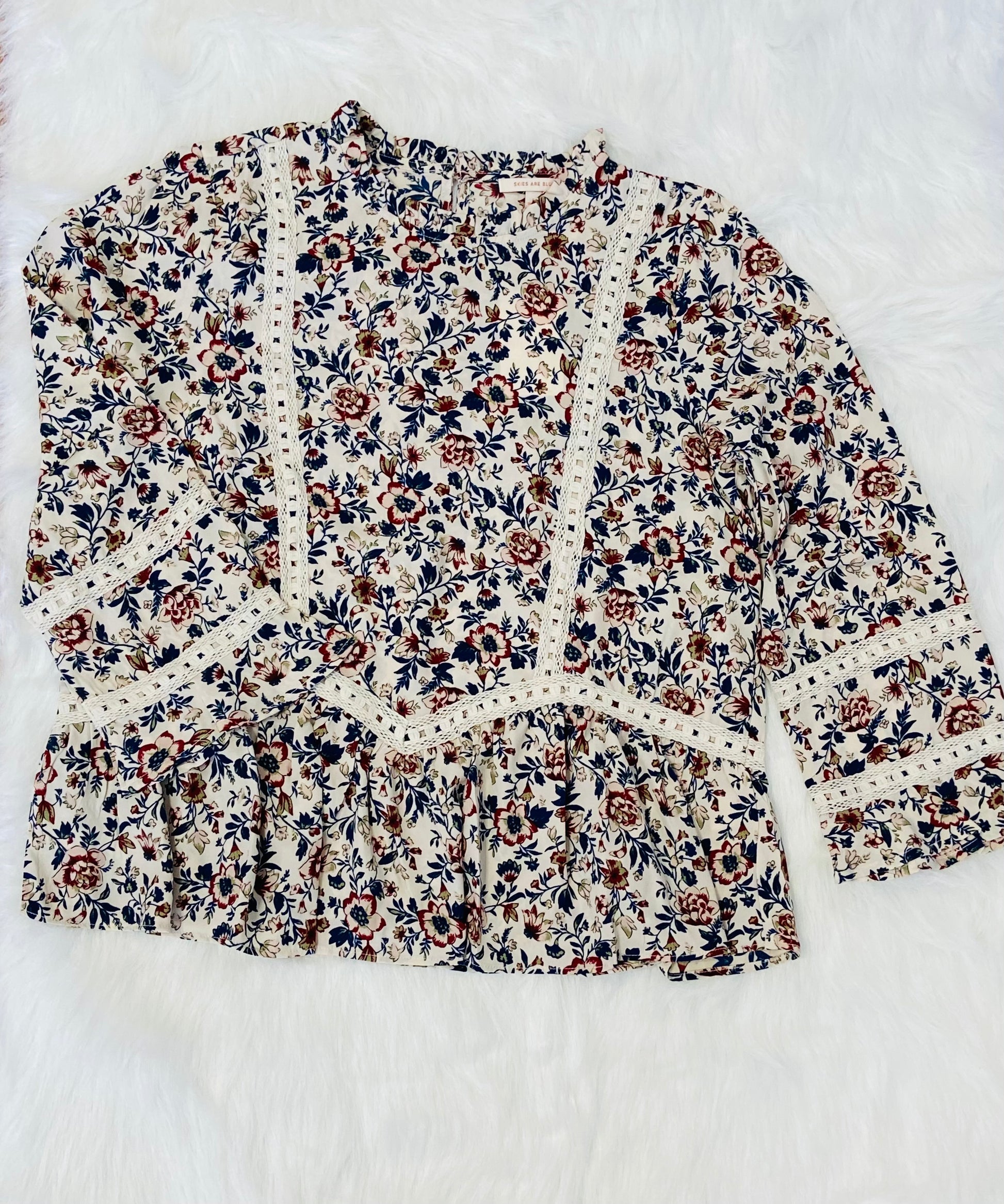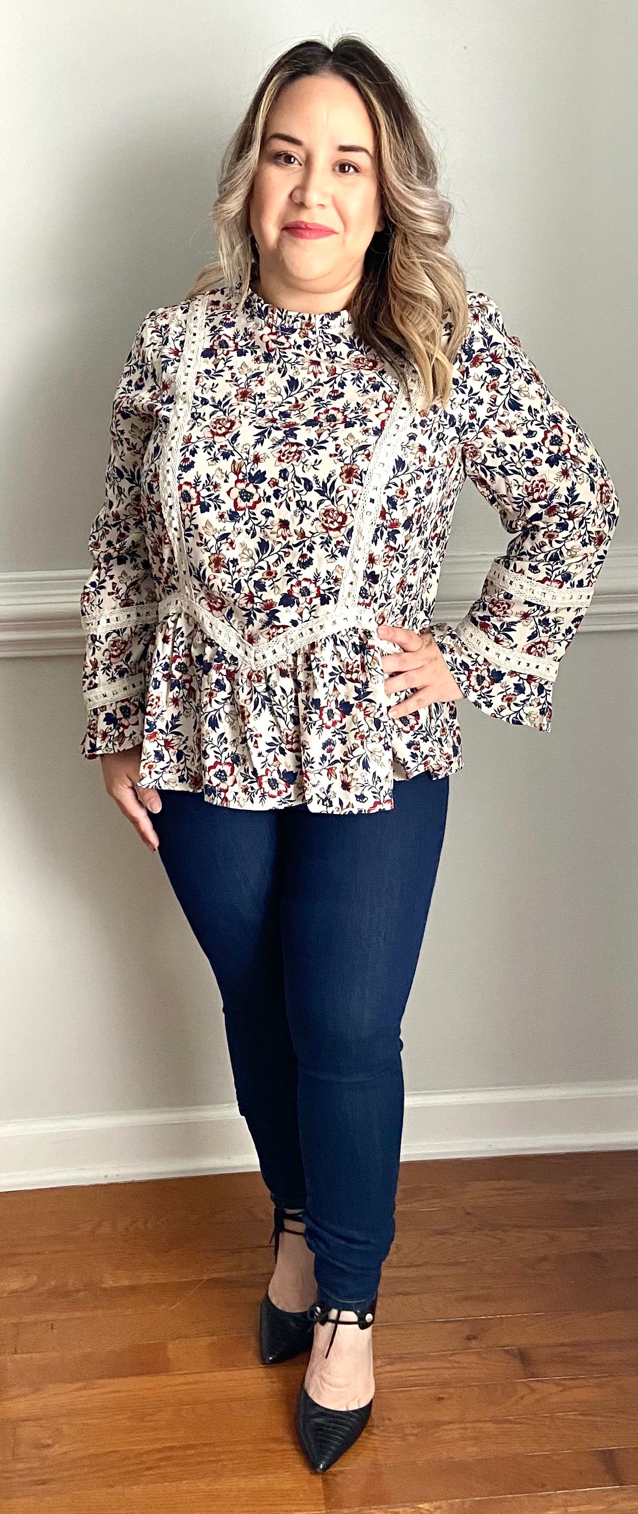 The floral top has beautiful crochet details. It also has a flared style perfect for an everyday look. If you are bigger in the chest area/bust area size up.