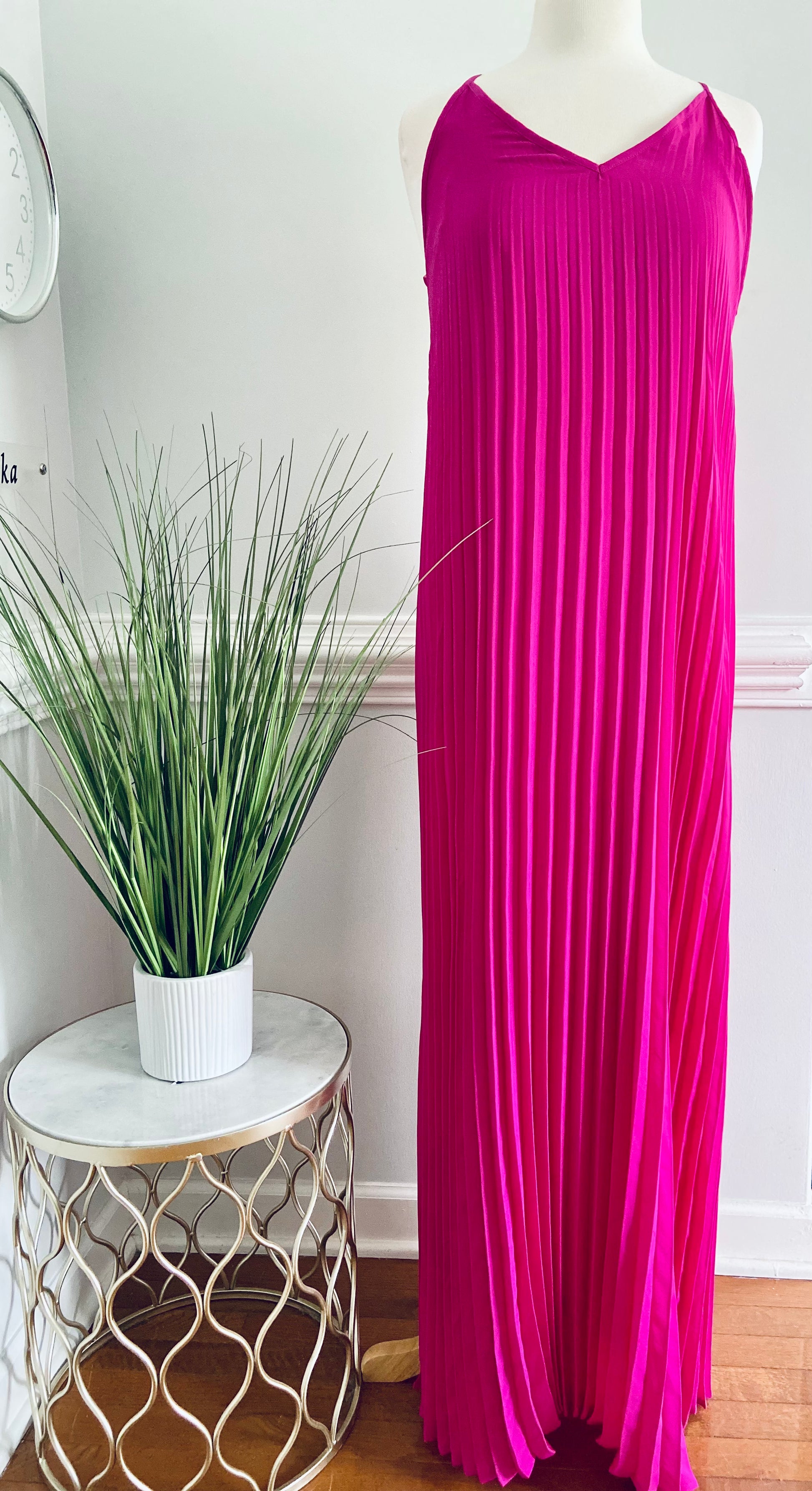 This sleeveless pleated maxi dress it is perfect for this summer. The Magenta color is so vibrant and beautiful. This dress can be style in so many ways. You can use your sandals or favorite heels. Put on your jean jacket and add a belt for a special touch.